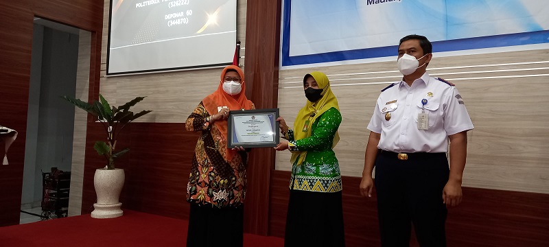 Kepala madrasah MTsN 3 Magetan ibu Susilowati, M.Pd hadir dalam acara tersebut, menerima penghargaan atas Satker terbaik dalam hal penyelesaian rekonsiliasi laporan keuangan tahun 2021.