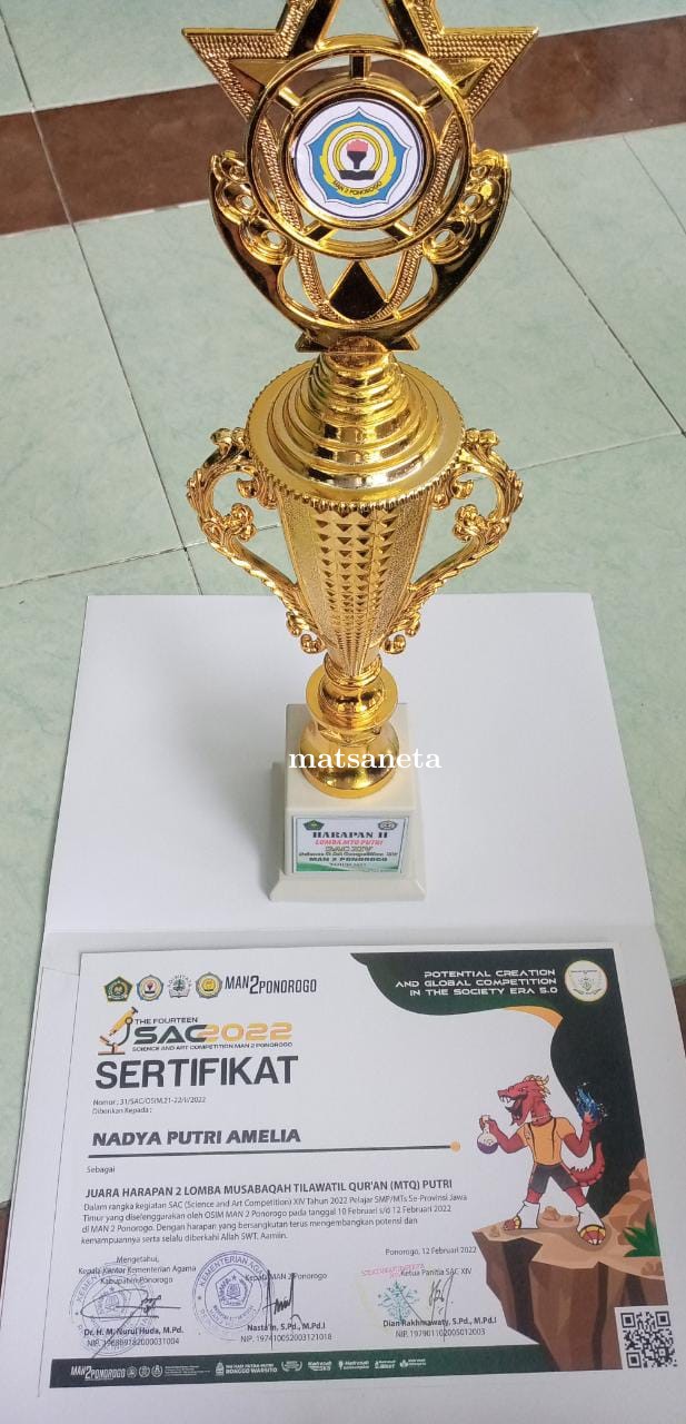 MTsN 3 Magetan (18/2), Kembali lagi siswi kita bernama Nadya Putri Amelia memberikan trophy kepada madrasah dengan menjadi Juara Harapan 2 MTQ se Jawa Timur dalam kejuaraan SAC 2022 yang diadakan di MAN 2 Ponorogo pada . . . 0